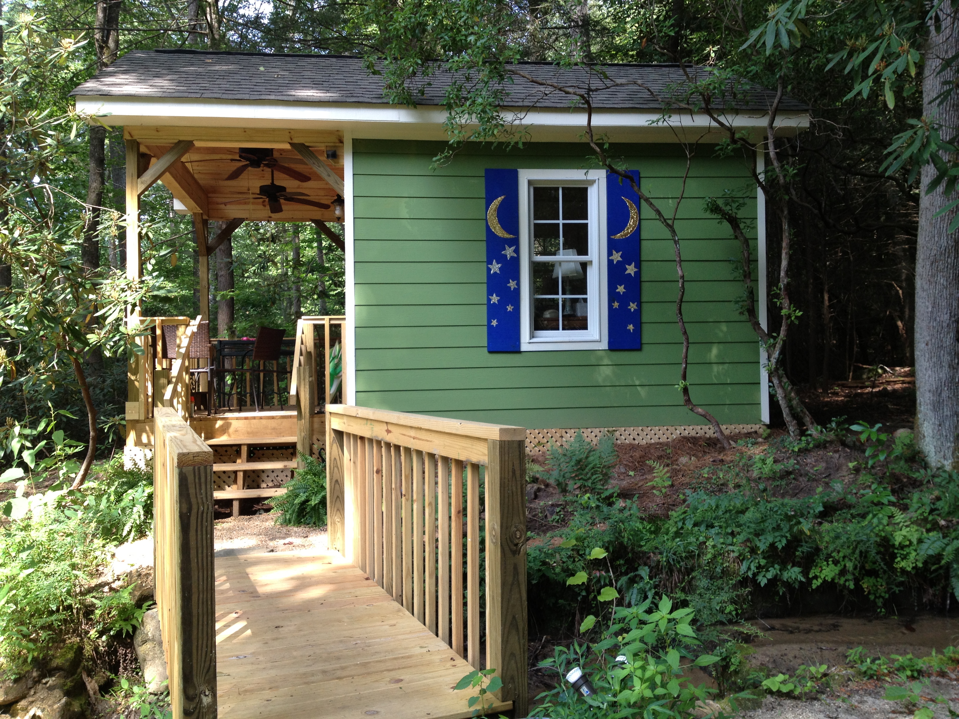IMG_1781Well, it’s been a while since I’ve been back to Annie’s Cabin and I’m a bit rusty, but hoping a little exercise will get things moving  along again.  March of this year saw Hollis and me undertaking the construction of my new writing studio, named WordSplash after a favorite phrase from one of my favorite crazy poets, Dylan Thomas.  And quite properly christened Castle WordSplash with a handmade sign by The Bear Man, Frank Nicolette, whose specialty is chain-saw carved bears.  And wizards.  And now signs for Annie’s Cabin!  And below I hope we’ll see WordSplash herself where I’ve been spending hours and hours since she was completed a few weeks ago.  Situated on a small knoll between two creeks leading into the bigger river creek down below, she is a cool place in every sense of the word.  And the good news is that the “real writing” is underway.  But it’s taken a while and before serenity could set in again, chaos had to reign, which it did, but now her reign is over and mine has begun!  But I do wish writing a blog were as user-friendly as writing a novel………….